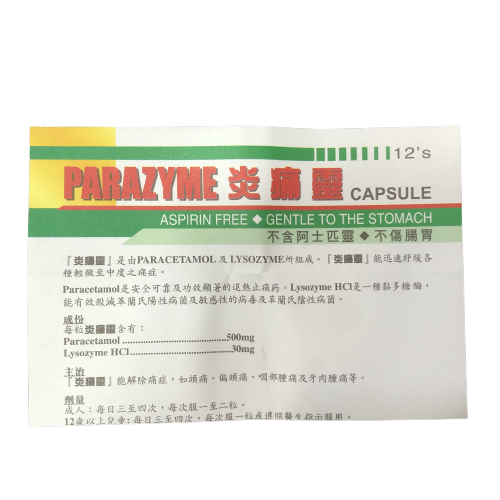 主治:各種痛症, 如 咽喉腫痛 及 牙肉腫痛等。 成份:Paracetamol 500mg, Lysozyme HCl 30mg PARACETAMOL是安全可靠及功效顯著的退熱止痛藥。LYSOZYME是一種粘多糖酶,能有效殺減革蘭氏陽性病菌及敏感的病毒及革蘭氏陰性病菌。